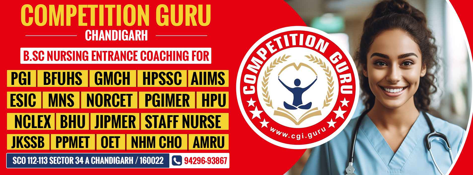 Competition Guru is committed to empower the young nursing aspirants of INDIA to explore the best in themselves and the world around them. Competition Guru assures that nursing aspirants should equip with the most relevant and comprehensive guidance factoring in all the parameters set for the nursing competitive exams. The technically sound Nursing Coaching Classes online and offline extended by us at our BSc Nursing Entrance Coaching in Chandigarh. We are aligned with the latest educational reform to help the students pursue their dreams in health care sector.